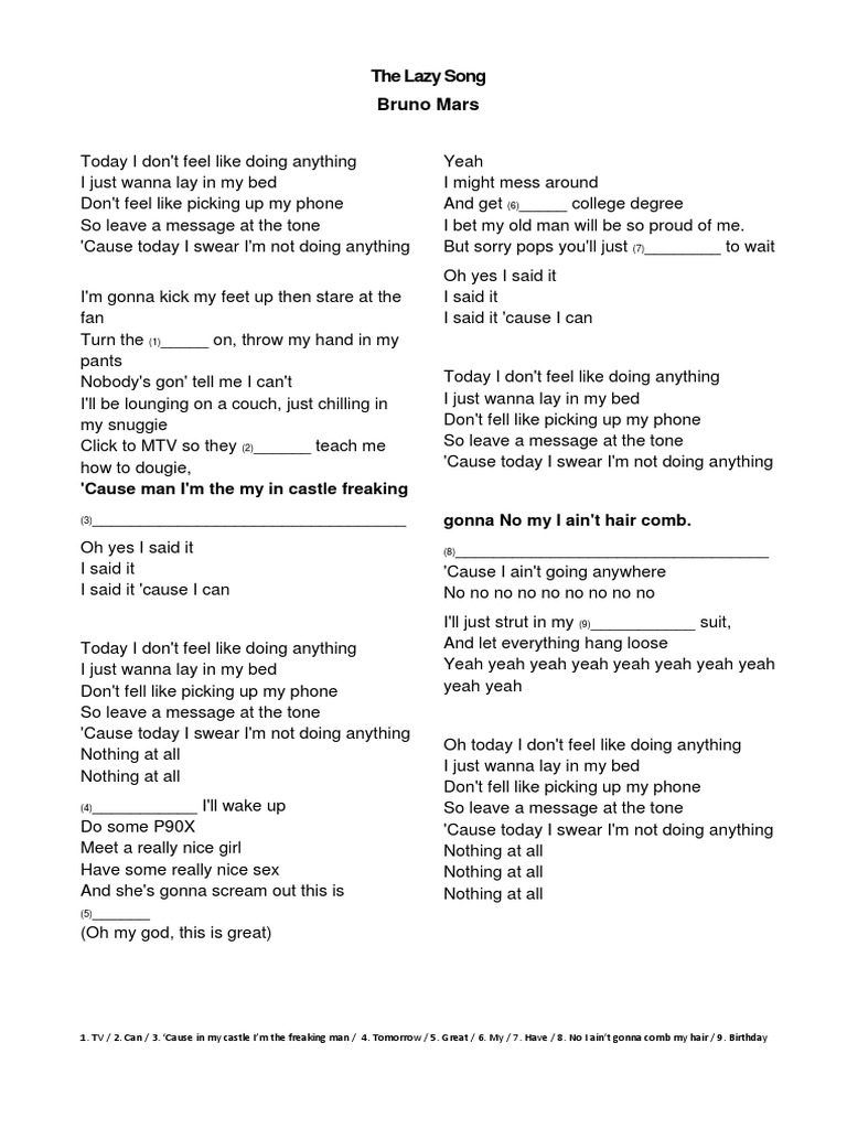 Bruno Mars The Lazy Song Esl Worksheet By Liisi89